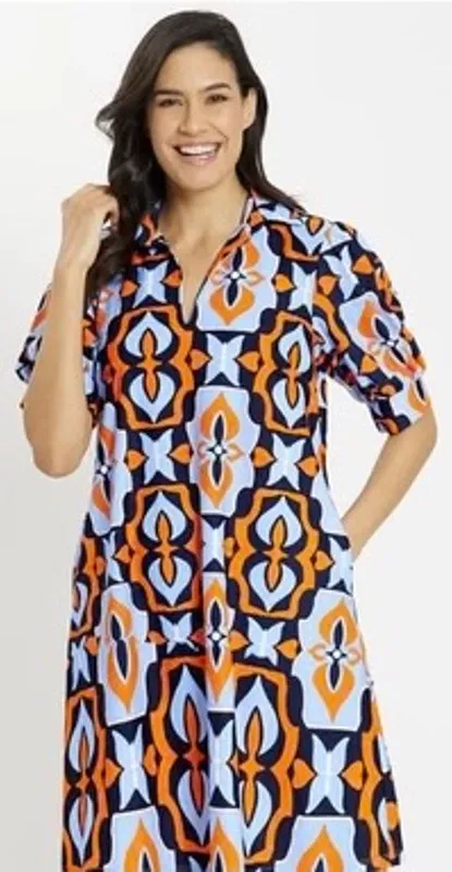 Emerson is a modern style dress with a V-neckline and puffed sleeves. A great addition to your wardrobe, as you can dress it up or down. If you prefer more coverage, try our longer length option which is an extra 3" long. In our signature Jude Cloth. Easy care, easy wear fabric. Made in the U.S.A. Details & Fit: V-neck and puff sleeve detail. Side pockets. Generous fit, please size down if you prefer a closer fit to the body. Regular Length- 35" from top of center back (Size S) Long Length- 38" from top of center back (Size S) Model is 5'10 and wearing a size Small. Color - Orange and Navy.