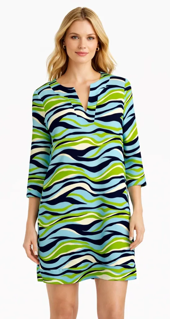 Megan remains a top seller for a reason – versatile, on-trend, and eternally chic! Featuring a V-neckline, ¾ length sleeves, and a subtle A-line silhouette with fashionable slits on the sleeves and hemline. It effortlessly transitions from day to night. Whether for everyday wear or travel, this dress is the perfect choice for any occasion. In our signature Jude Cloth fabric. EasyCare, EasyWear. Made in the U.S.A. Details & Fit: V-neckline with 3/4 sleeve. Slits on hemline and sleeve. Fabric & Care: Nylon/spandex. Machine wash only. Do not bleach. Cool iron if necessary. Chest: 22” Length: 36” Like new condition