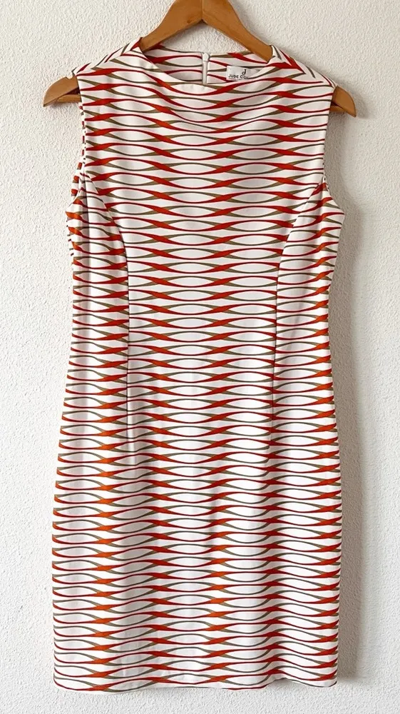 size M. Chic, comfortable, and travel-friendly, this Jude Connally sleeveless mini dress features a flattering boat neckline and bold orange & white geometric stripe print. Crafted from the brand’s signature stretchy, smooth fabric, this shift-style dress offers effortless polish for work, brunch, or vacation days. Lightweight, wrinkle-resistant, and easy to wear—just slip on and go. Details: • Sleeveless boat neck silhouette • Bold orange & white geometric stripe print • Stretchy, unlined fabric for all-day comfort • Zip-back closure • Perfect for work, travel, or weekend wear • Excellent condition, no flaws Measurements: Length: 35.5” | Bust: 20” | Waist: 15–20” stretched