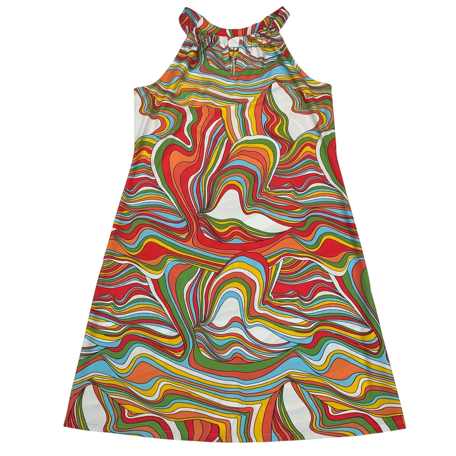 Excellent preowned condition No flaws A spring & summer classic that will take you from day to night - the Lisa is the perfect amount of reveal & conceal Jude Cloth fabric Psychedelic groovy pattern -bright multicolor ribbons Easy care, easy wear Made in the U.S.A. Gathered neckline with keyhole detail A-line silhouette