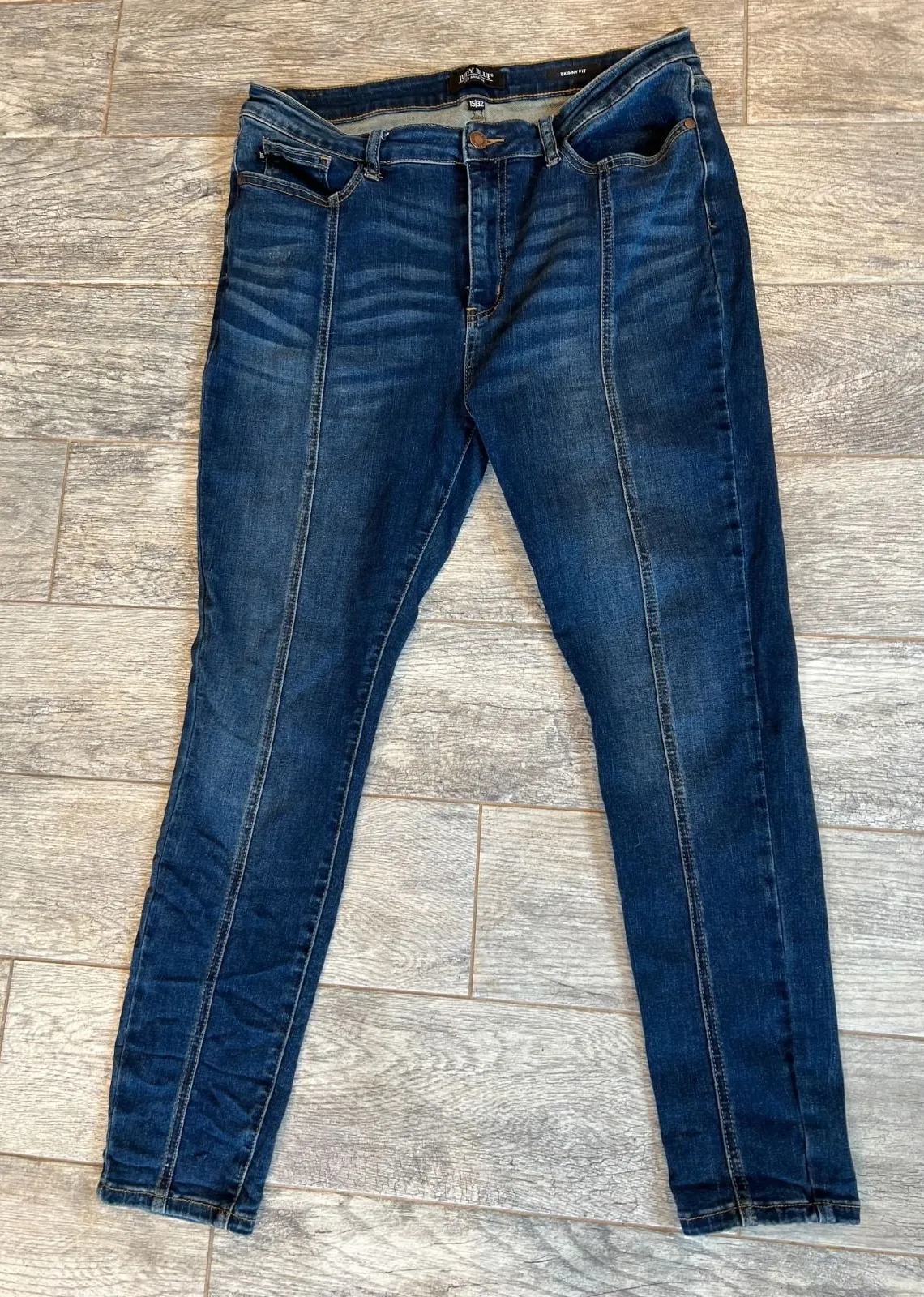 Judy Blue Los Angeles 15 x 32 Womens 15x32 Denim Jeans Jean Skinny fit JB8863 Whiskering and sand blasted front. Two front, 2 back pockets. 71% cotton 21% Rayon 7% Polyester 1% Lycra Spandex. Made in China Hand wash. Waist measures 17" laying flat across, rise 11", inseam 27.5", leg opening 5.5". Great preowned condition with no stains. Distressing by design as pictured. Perfect for the college preppy business casual western cowgirl rodeo gal. 0118.c450.20240112