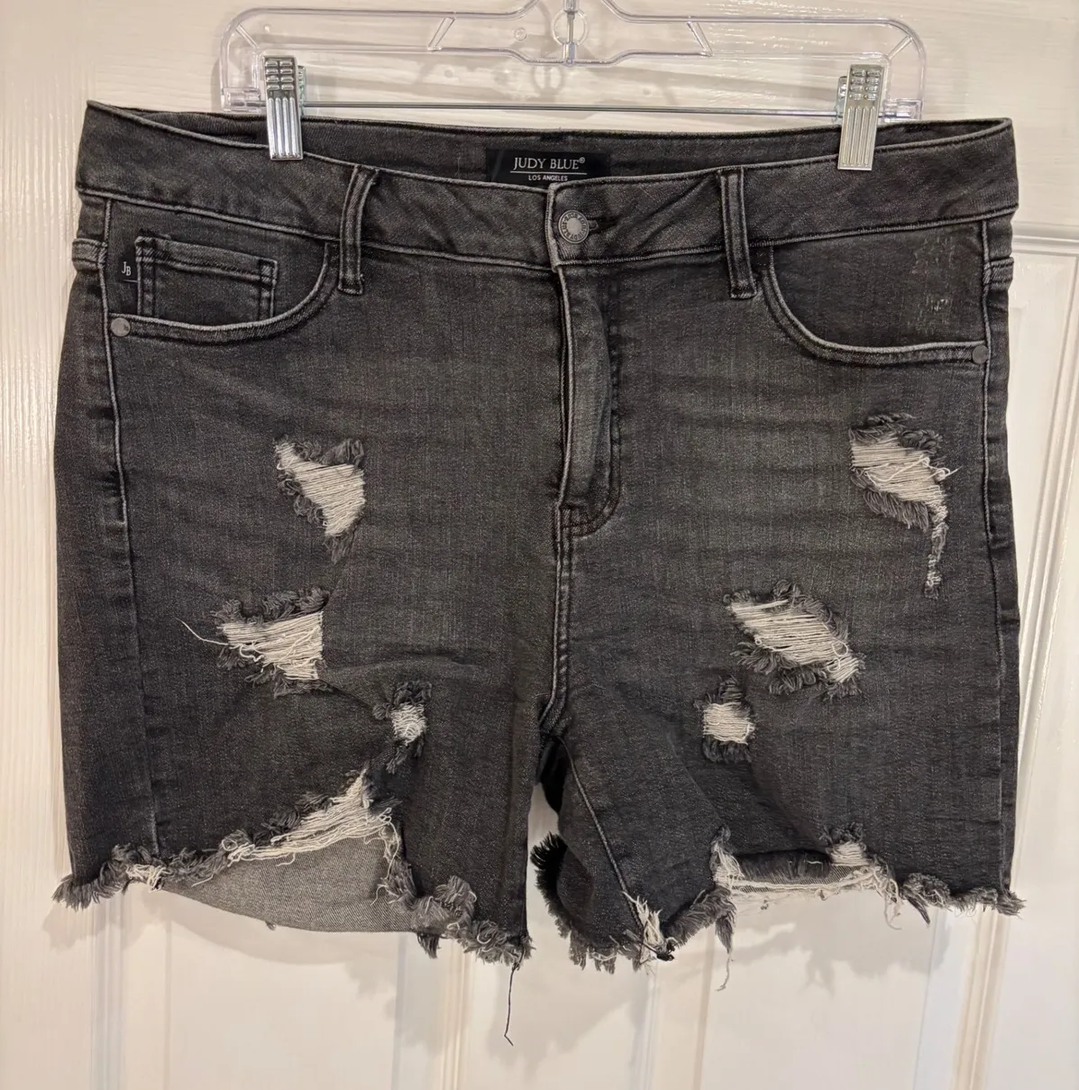 Stylish and comfortable Judy Blue denim shorts, perfect for casual wear. These plus-size shorts feature a trendy distressed design with strategically placed rips and a modern frayed hem. The gray wash adds a versatile touch, making them easy to pair with various tops and shoes. They offer a classic five-pocket styling and a comfortable fit. Great for summer outings, concerts, or relaxed weekends. Style: Cut-Off Color: Gray Department: Women Fabric Type: Denim Material: Spandex, Polyester Blend, Denim Occasion: Casual Character: Denim Diva, Rocker Chic, Graycie, Distressed Darling, Ash Pattern: Solid Performance/Activity: Casual Wear, Concerts, Summer Outings, Weekend Wear, Everyday Fit: Regular