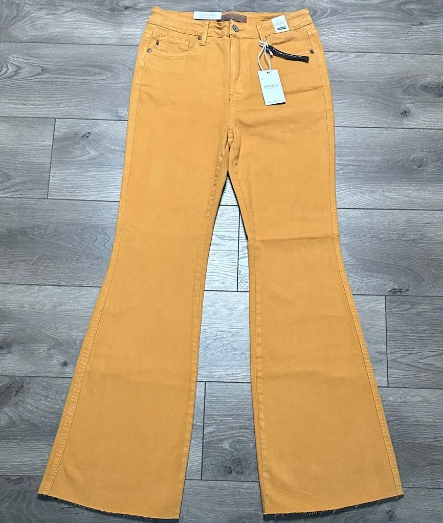 Judy Blue 31” High Waist Flare Jeans Marigold Tummy Control Size 29 New with tag! Stretch fabric Garment dye Raw hem Front zipper closure Color is a orange/mustard yellow See pictures for measurements