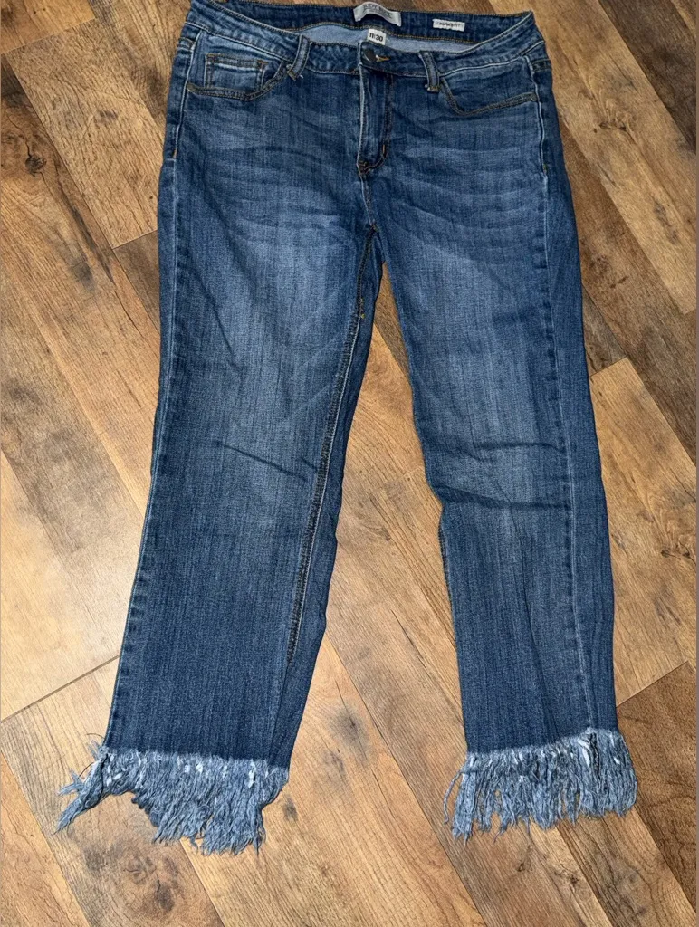 Chic cropped jeans with a stylish frayed hem. Perfect for everyday wear.This is a pair of cropped ankle Judy blue jeans with long frayed hem. The size is 30 28 inseam the fringe hangs about an inch further down excellent condition
