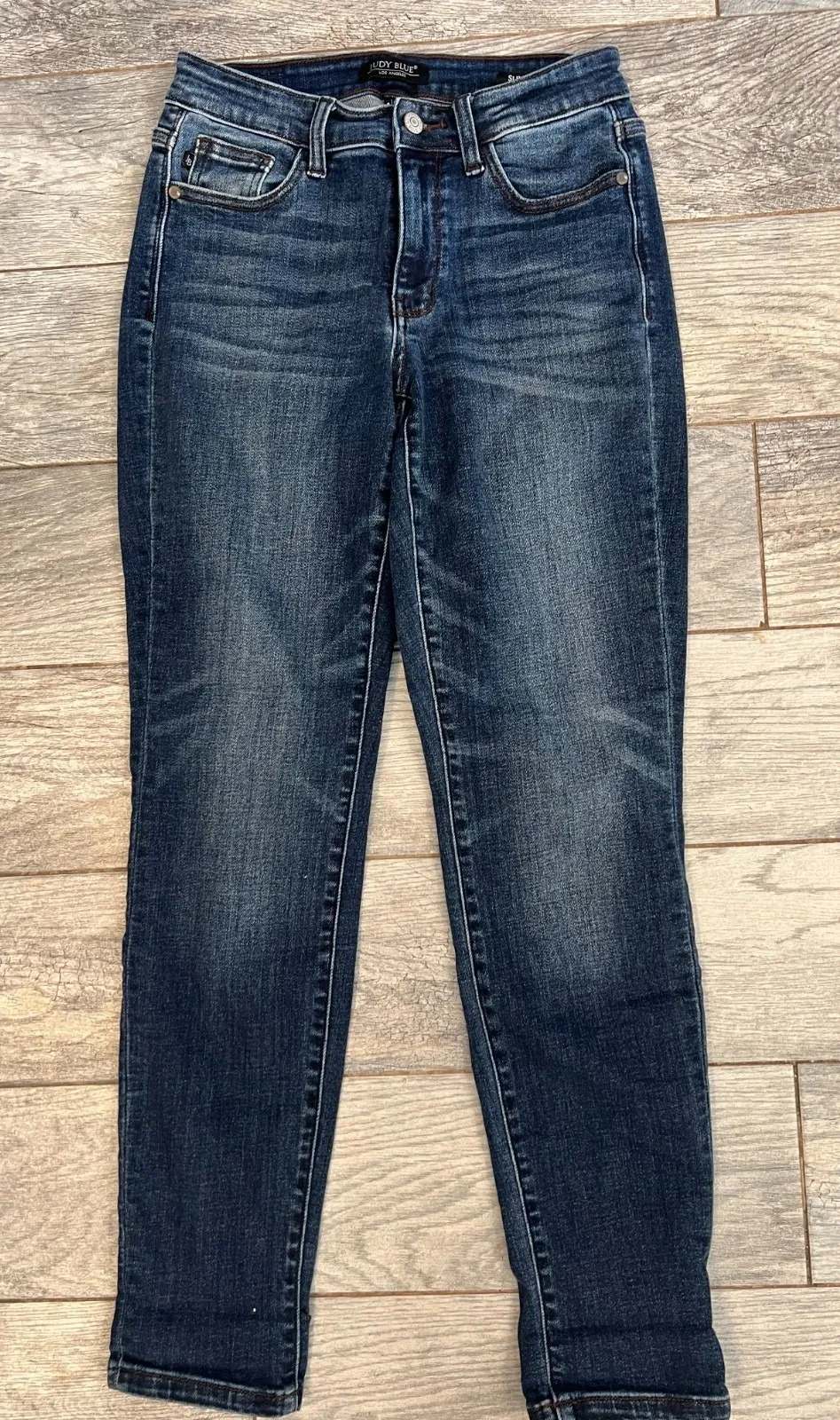Judy Blue Denim Jeans 1 / 25 Slim Fit Jean Stretch of 93% Cotton 6% Polyester 1% Spandex. Made in Vietnam. JB82428DK Whiskering and sand blasted front. Machine washable. Waist measures 13.5" laying flat across, rise 9", inseam 30.5", leg opening 6". Great preowned condition with no rips or stains. perfect for the country western cowgirl rodeo business casual lady. 2192.gw031025.c450 36