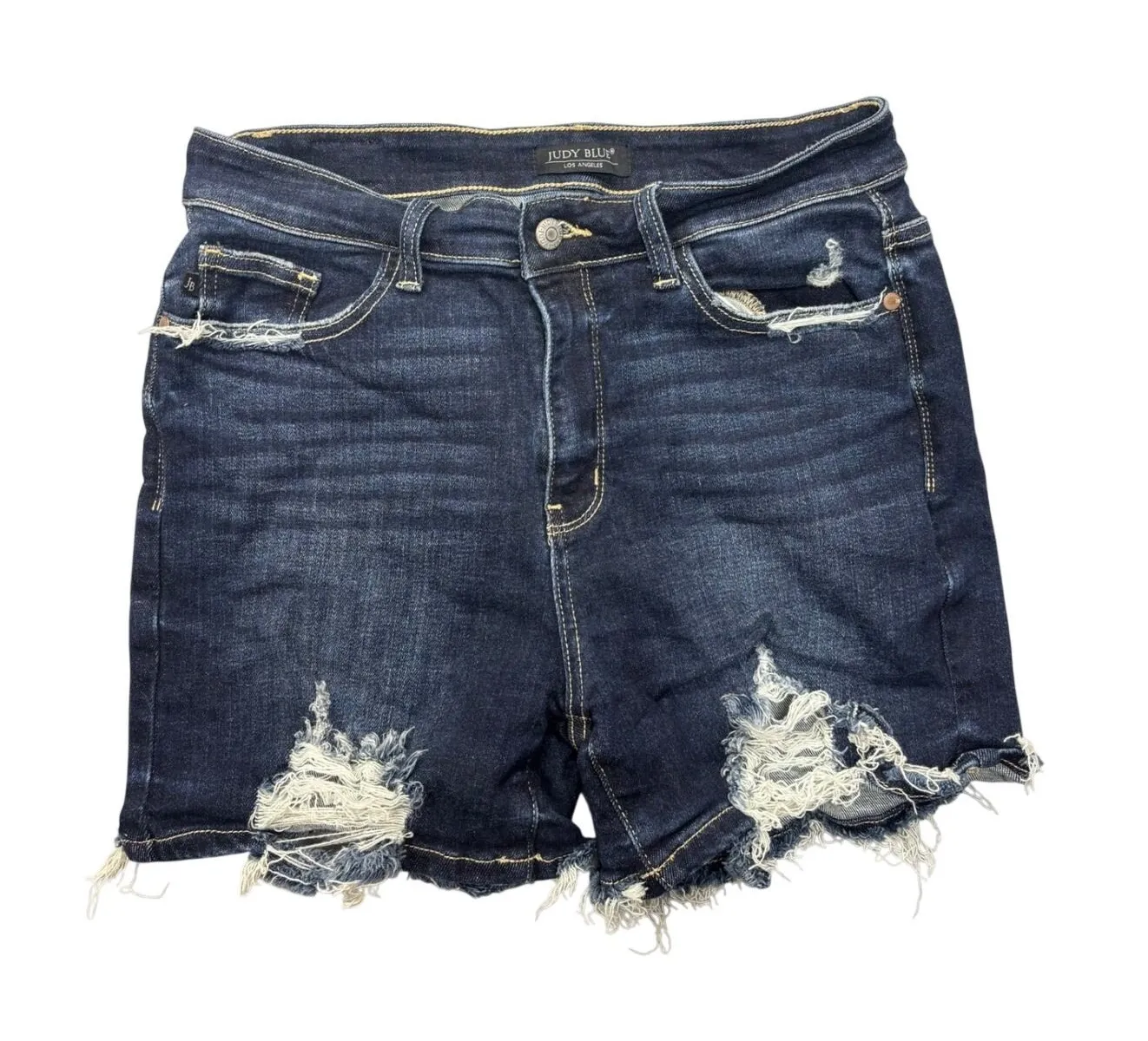Judy Blue dark wash denim shorts with a distressed design in the size women's large. These shorts feature a frayed hemline and subtle distressing on the front pockets and leg openings, adding a touch of edgy style. The classic five-pocket design and belt loops offer practicality. A button and zip fly closure ensures a secure fit. These are in a classic dark wash and are in excellent preowned condtion with no flaws to note. Approximate Lay Flat Measurements: • Waist: 14.5 in • Inseam: 3.5 in • Rise: 10.5 in • Leg Opening: 10 in Keywords: Judy Blue shorts, denim shorts, distressed denim, frayed hem, dark wash, women's shorts, summer shorts, casual shorts, streetwear, festival wear, boho shorts, trendy shorts *From a smoke free home *Ships next business day