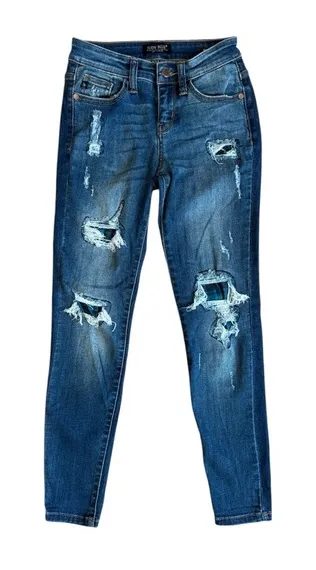 Pre-Owned Judy Blue skinny fit jeans are in great condition. No stains. Very clean. • Size 0/24 Approximate Measurements are shown in photos. • Waist laying flat measures 11” • Skinny Fit • Style# JB82140DK • Button and Zipper work as they should • Green/Blue plaid patches • Please see all photos Feel free to ask questions!