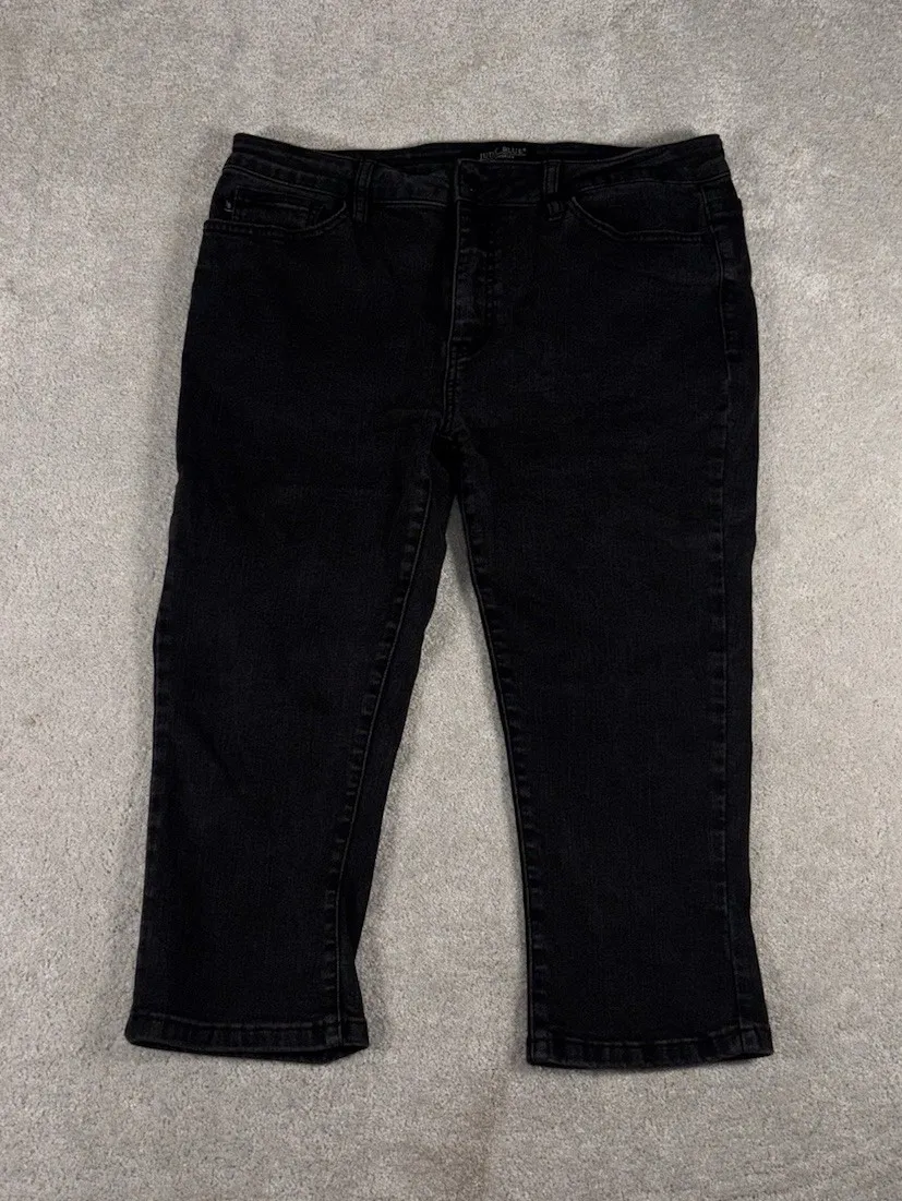 The product is a pair of Judy Blue Women's Capri Fit Black Denim Mid Rise Cropped Stretch Jeans in s... Show more