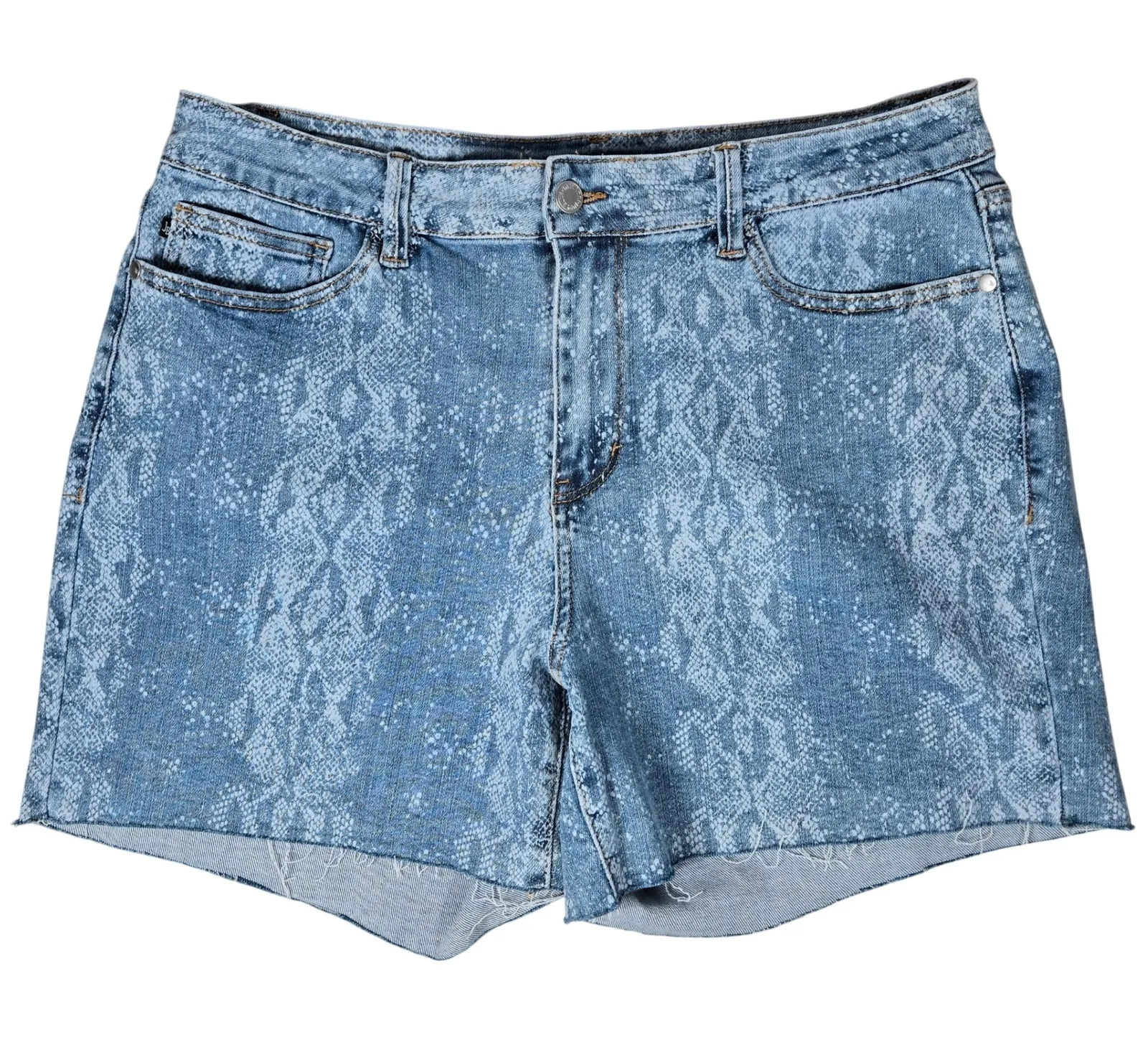 Judy Blue Los Angeles Women's 1XL Blue Snake Print Denim Cutoff Shorts Size 1XL Measurements are shown in photos. In great pre-owned condition with no known flaws and minimal signs of wear. Keywords: Judy Blue shorts, women's denim shorts, snake print shorts, cutoff denim shorts, high rise shorts, plus size shorts, summer shorts, casual shorts, fashion shorts, distressed denim, raw hem shorts, Los Angeles brand, 1XL shorts, designer denim