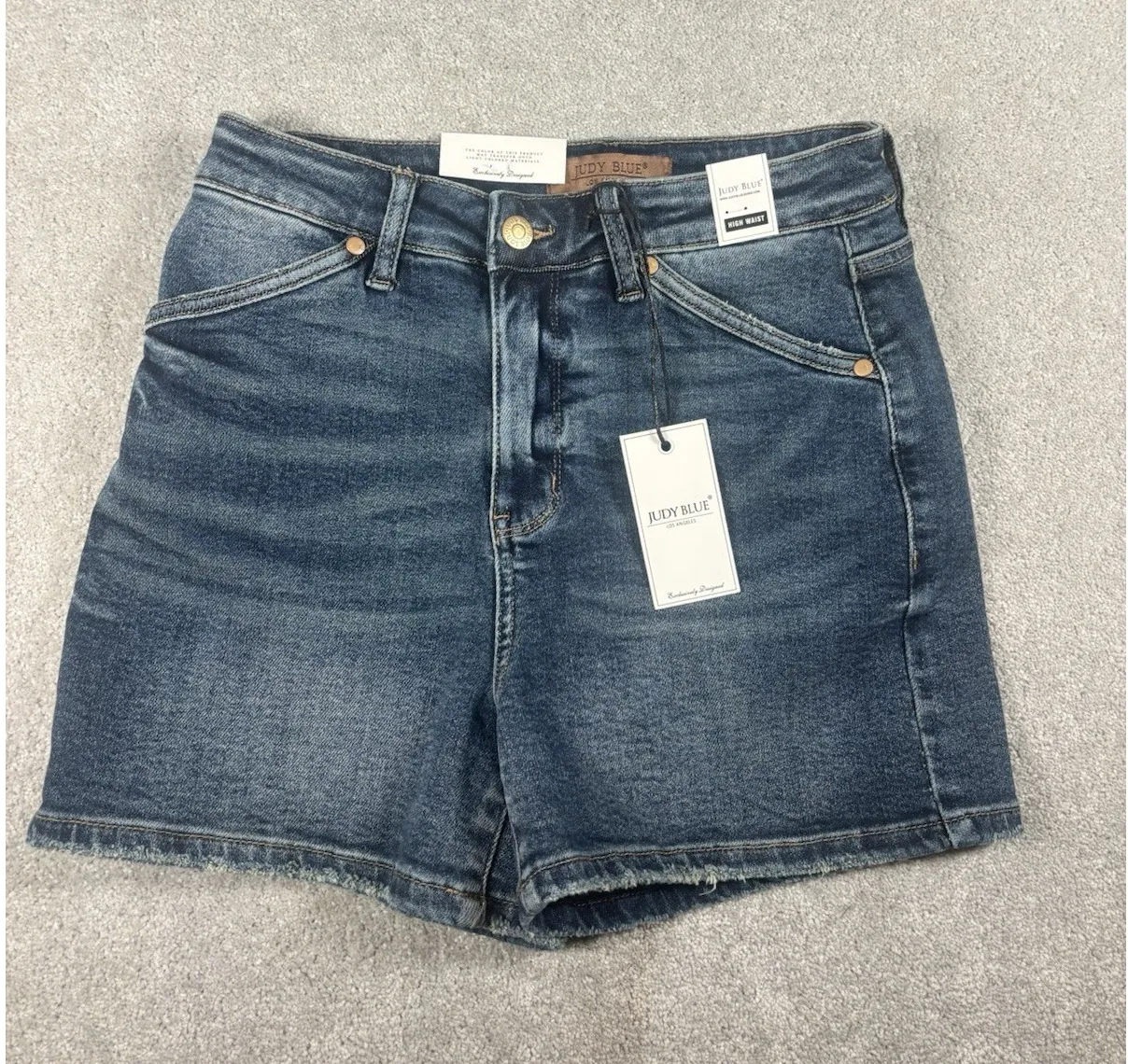 The Judy Blue NWT Shorts in a high rise midi length with a dark wash are a stylish addition to any woman's wardrobe. Made with a medium fabric wash, these shorts are perfect for everyday wear. The medium size and classic blue color make them versatile for any casual outfit. The mom style adds a touch of comfort and nostalgia to the overall look, making them a must-have for any fashion-forward woman. 5519