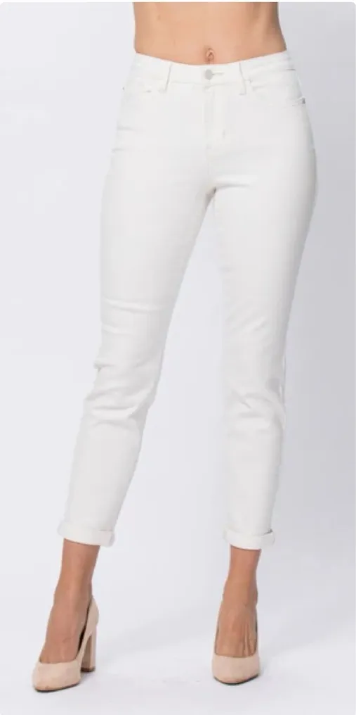 Description: Judy Blue Kathleen Hi-Rise Ecru Cuffed Boyfriend Jeans in a crisp white/ecru wash. Fea... Show more