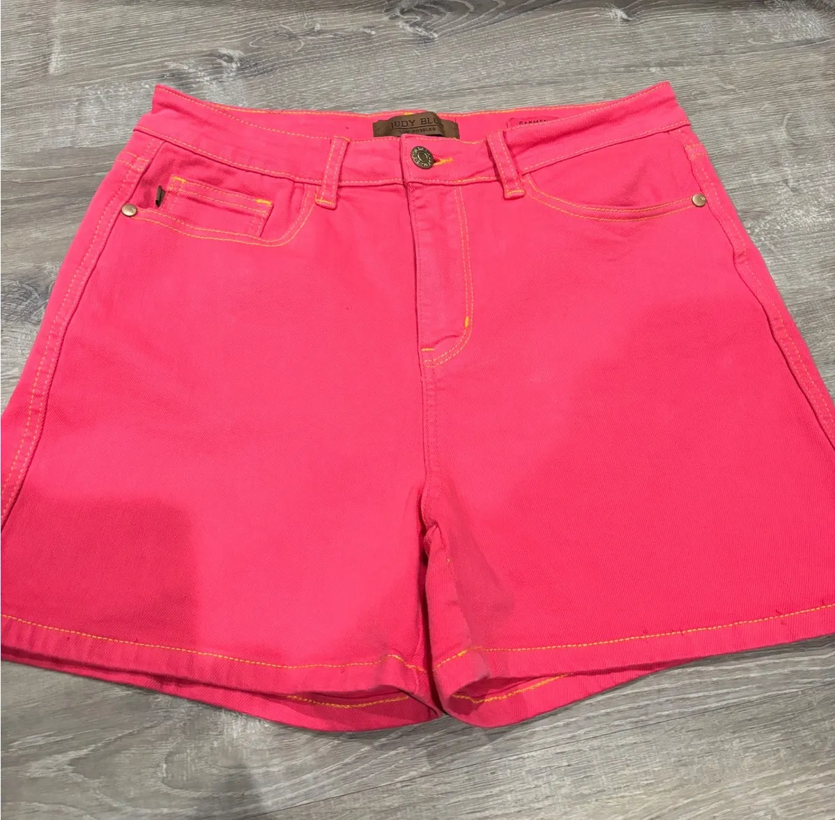 Radiant energy bursts from these Judy Blue denim shorts, a vibrant statement piece for your wardrobe. The eye-catching pink hue is perfectly complemented by contrasting yellow stitching, adding a playful yet sophisticated touch. Designed with a flattering high waist and classic five-pocket styling, these shorts offer both comfort and style. The garment-dyed finish ensures a rich, lasting color that will turn heads wherever you go. Perfect for a sunny day at the beach, a casual brunch with friends, or adding a pop of color to your everyday look. Keywords: Judy Blue, Pink Shorts, Denim Shorts, High Waist, Womens Shorts, Bright Colored, Summer Shorts, Casual Shorts, Size L, Los Angeles, Garment Dyed, Colored Denim