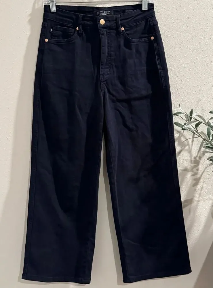 Judy Blue Wide Leg Tummy Control Cropped Jeans, Navy, Size 5. Garment-dyed with a flattering wide-leg cut and tummy control design. Excellent used condition, perfect for stylish comfort! **Item measurements are photographed, so please inspect all photos carefully. **Items are pre-owned so they may have some wear and tear. Any imperfections will be shown in the photos, but all items will be sold as-is. **Please be aware that items may be a slightly different color than expected due to inconsistencies in screen displays and/or lighting. **Comes from a smoke-free home. **Please contact me if you have any questions before purchasing.