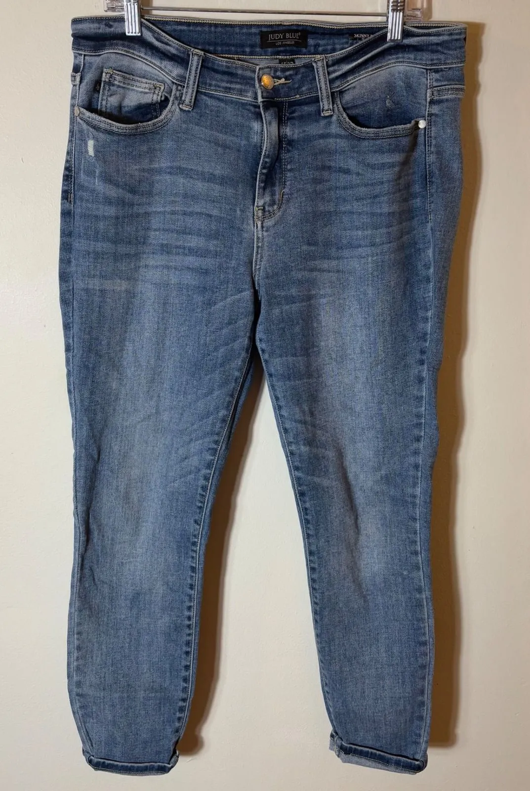 Introducing your new go-to denim: a pair of Judy Blue skinny jeans designed to flatter and move with you. These jeans feature a comfortable mid-rise waist and a classic five-pocket design, complete with subtle distressing for a touch of effortless cool. The light wash denim offers a versatile foundation for any outfit, easily dressed up with a silky blouse and heels or kept casual with a tee and sneakers. Picture yourself rocking these jeans on a weekend brunch date, during a shopping trip with friends, or while enjoying a casual Friday at the office. Style: Skinny Color: Blue Department: Women Type: Jeans Fabric Wash: Light Accents: Button Features: Pockets, Stretch, Distressed, Cuffed, Comfort Fit: Skinny Pattern: Solid Rise: Mid (8.5-10.5 in) Fabric Type: Denim Material: Cotton Blend, Spandex Closure: Button, Zip Keywords: Judy Blue, Skinny Jeans, Womens Jeans, Denim Jeans, Light Wash Jeans, Distressed Jeans, Mid Rise Jeans, Size 15/32, Casual Jeans, Comfortable Jeans, Everyday Jeans, Fashion Jeans, Stylish Jeans, Designer Jeans