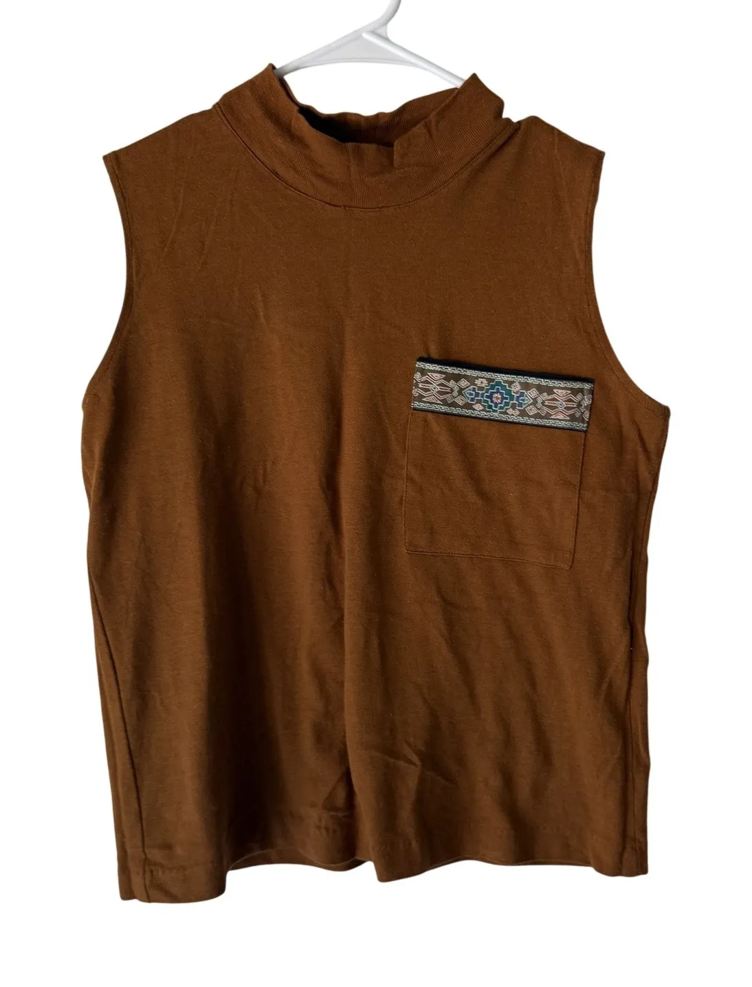Judy Knapp Shirt 70s Vintage Brown Mock Neck Sleeveless Boho Pocket Aztec Trim Condition: Good pre-owned condition, gently worn, no visible flaws Soft brown knit fabric with mock neck design Sleeveless cut, ideal for layering or warm weather Features a front pocket with decorative Aztec-inspired woven trim in blue, tan, and cream Tag size: Medium (Womens) – see photos for approximate flat measurements Brand: Judy Knapp California Perfect for casual outfits, festival wear, or boho-inspired looks Unique southwest style accent on pocket