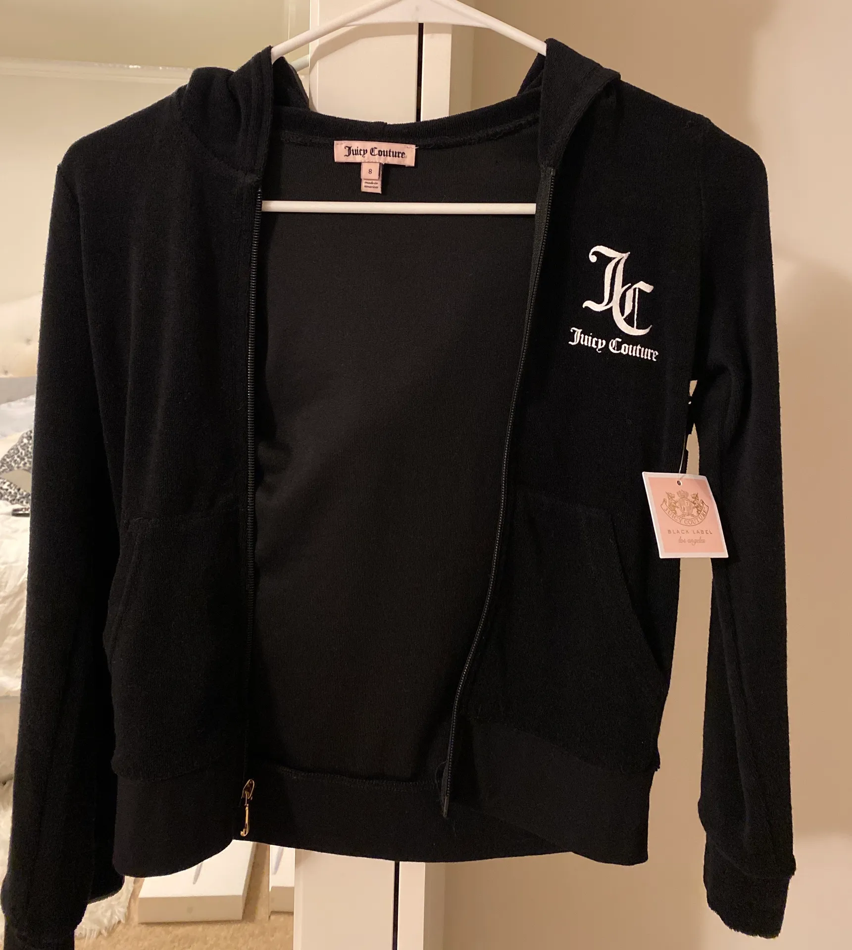 Black cropped juicy couture zip up jacket! Velour material. Size says 8 but I would say this fits a... Show more