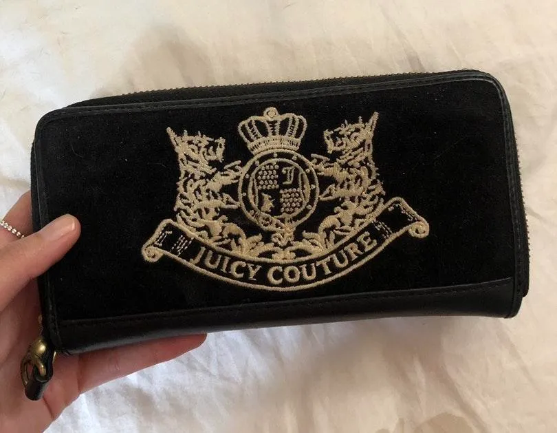 Black velour juicy couture wallet. 16 card slots, inside coin compartment and inside divider, outsid... Show more