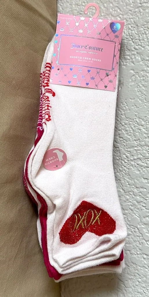 Soft pink socks with red heart and love pattern. Stylish and comfortable. 6 pairs of crew socks Val... Show more