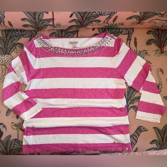 Designer JUICY COUTURE Crew Neck Long Sleeve Cotton PINK WHITE STRIPE Bling Shirt Size L, see photos... Show more