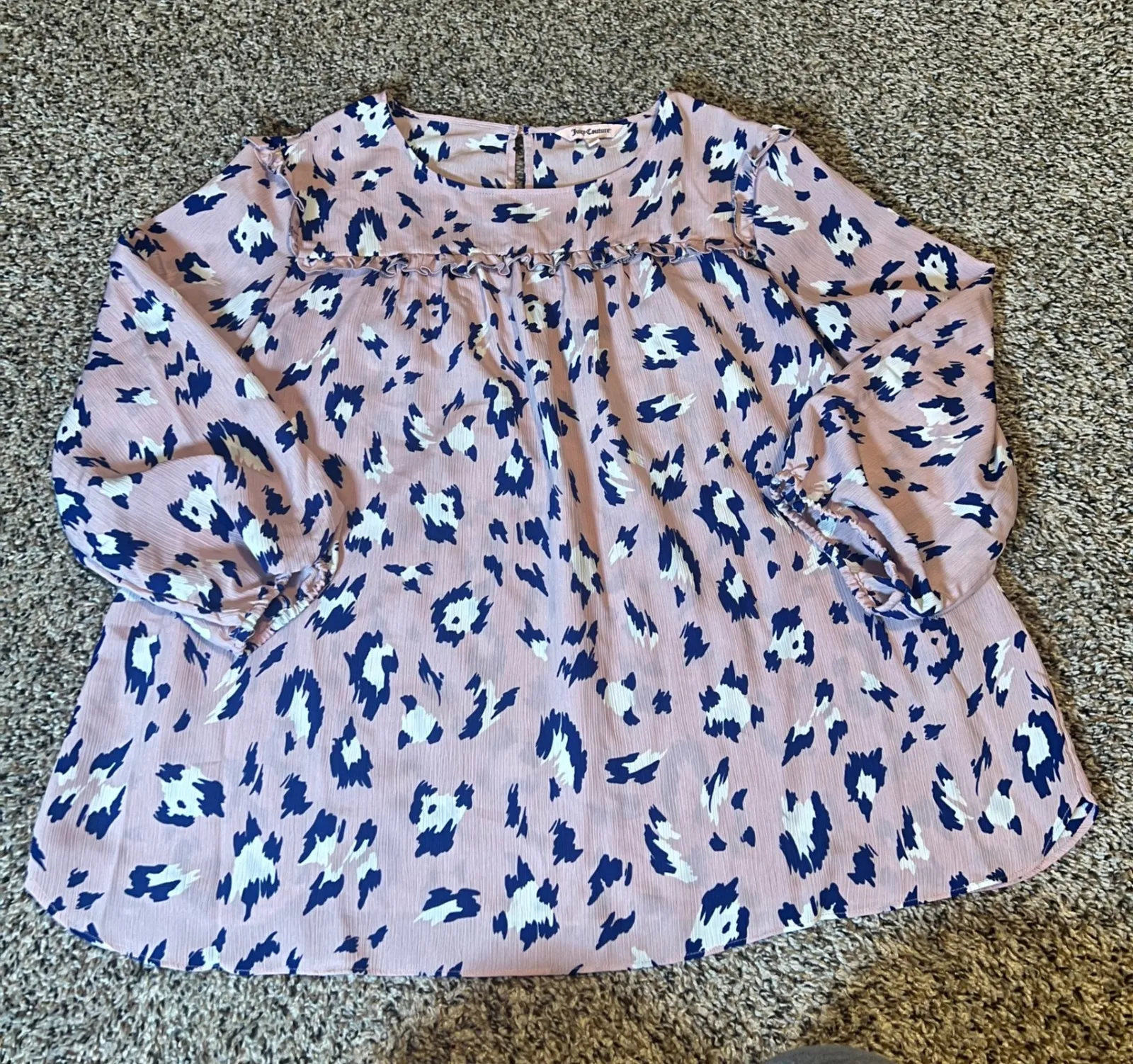 Juicy Couture women's long sleeve blouse in a playful pink and navy leopard print. This charming top... Show more