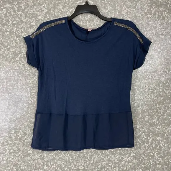 Women's chiffon peplum top by Juicy Couture. This navy blue tee has a trim at the waist of chiffon,... Show more