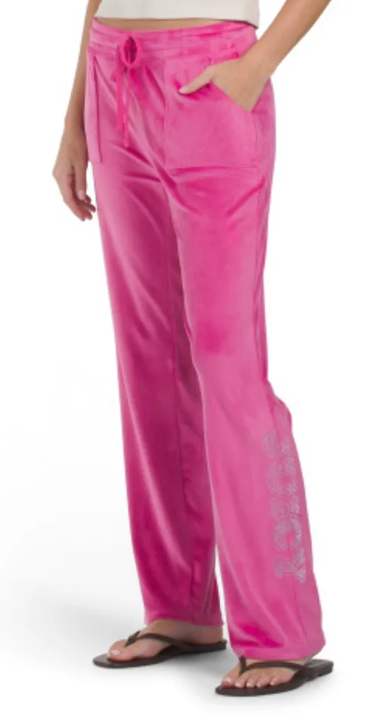 Soft pink velour pants. Elastic waistband with drawstring. Side pockets for convenience. Juicy Coutu... Show more
