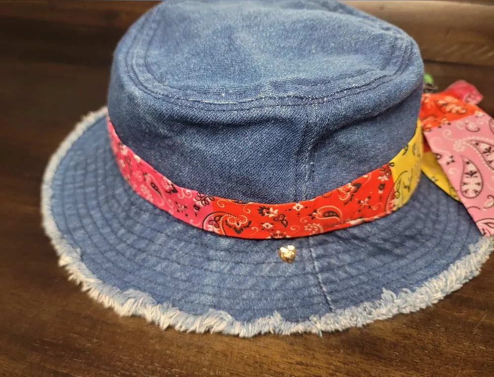 Juicy Couture denim bucket hat, often described as having a distressed or frayed brim. The specific... Show more