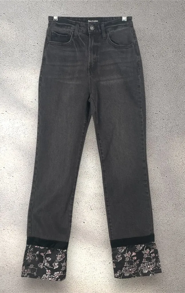 juicy couture embroidered cuff straight jeans 🖤 super cool black denim with rare floral satin cuffs... Show more