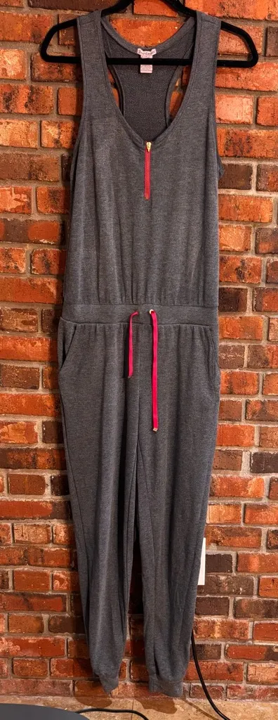Juicy Couture womens sleeveless t-back jogger jumpsuit with contrast drawstring gray S. The zipper p... Show more