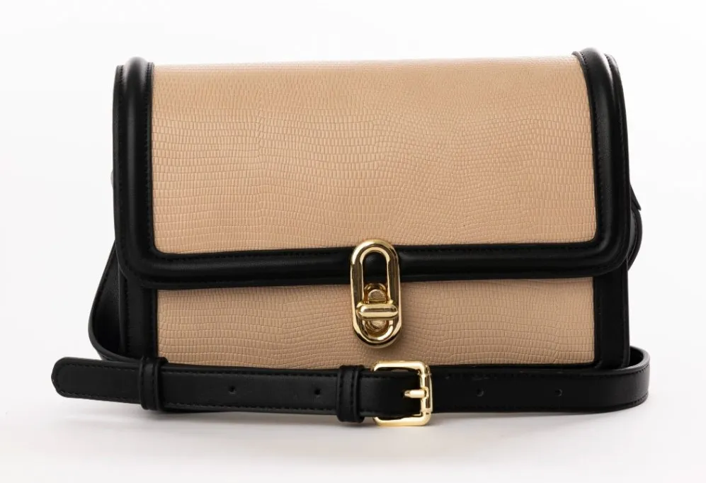 One Size Elevate your style with this chic crossbody bag in tan and black. Perfect for daily use, it combines functionality with a sleek design. New in packaging, see pics. from website: Elegant Vegan Leather Satchel featuring luxurious rose gold-tone metal hardware. This stylish accessory is designed with an adjustable buckle strap for a comfortable, custom fit and a secure turn lock flap closure to keep your essentials safe. Perfect for adding a touch of sophistication to any outfit.