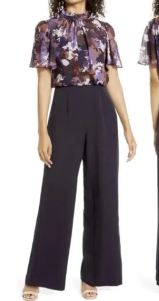 Julia Jordan Size 6 women's US Gorgeous and fun jumpsuit that looks like a shirt and pants The top is a flowy floral print chiffon with a liner top Pants are navy blue; wide leg trousers Ruffle neck; short sleeve Office professional casual everyday bold floral flowy unique stylish one piece day to night meeting Top & Lining: 100% polyester / Pant: 96% polyester/4% spandex Measurements taken across the front when laying flat: Bust: 18", Waist: 15", Rise: 29", Inseam: 30" In excellent condition; no stains, holes or flaws