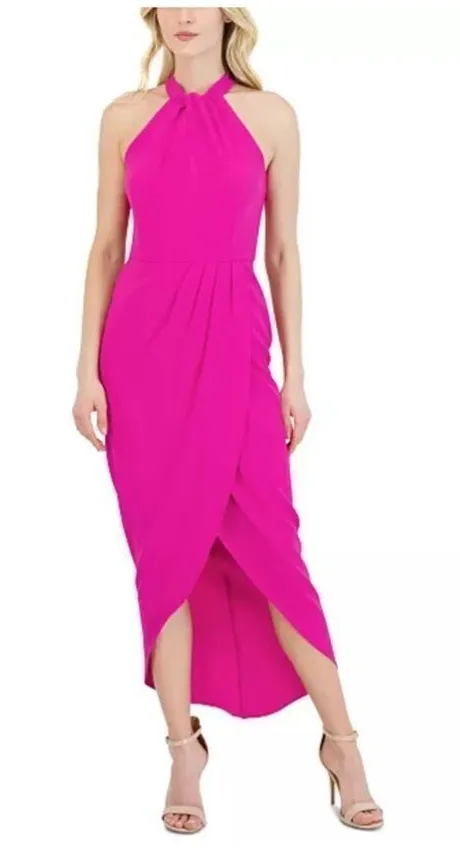 Julia Jordan knot neck tulip hem dress. This sleek and sophisticated design is perfect for garden parties, galas, special milestones, festivals, or outdoor events. The faux wrap halter dress reaches just above the ankles and features two back button closures with a concealed zipper and keyhole detail. Material: 97% polyester, 3% spandex; lining: 100% polyester Care: Machine wash cold or dry clean Size: 10 Style Number: P5 74 #tuliphem #halterdress #knotneck #specialoccasion