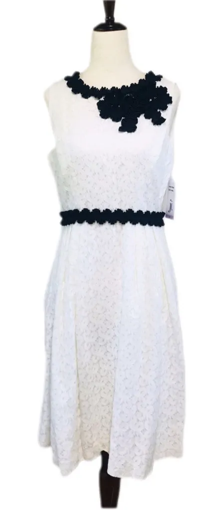 Julia Jordan White Lace Dress with Black Ribbon Trim Condition: New With Tags - faint mark on back. See photos Size: 6 - see measurements in photos Lace fabric A-line silhouette Knee length Round neckline Sleeveless Black pleated ribbon trim at neckline and waist Back zip Lined Thanks for looking! Tags: spring summer Easter brunch party cocktail