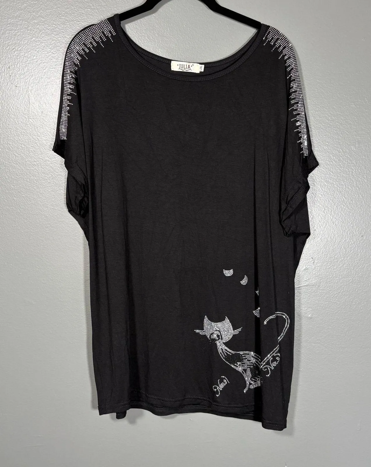 Women's whimsygoth dopamine bling top by Julia. This black top has rhinestones accents in the shape of a cat and on the shoulders, a long length, and short sleeves. It is a cotton elastane blend. The top is a size L/XL. When laying flat it measures approximately: Armpit to armpit: 24 inches Length: 31 inches The top is in amazing shape.
