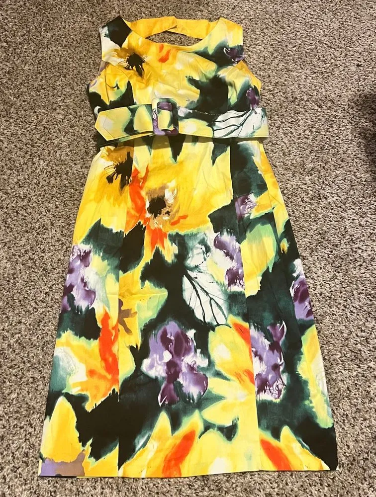 Stunning sleeveless dress featuring a vibrant watercolor floral print in yellow, purple, and green tones. The dress comes with a matching belt and elegant ruffle detail at the neckline. Perfect for summer garden parties, outdoor weddings, or any special occasion. The fabric has a beautiful drape and the silhouette is flattering with its fitted waist and A-line skirt. In excellent condition with no visible signs of wear. Keywords: floral dress, summer dress, watercolor print, sleeveless dress, belted dress, Julian Taylor, yellow dress, party dress, wedding guest dress, A-line dress, ruffle dress, cocktail dress