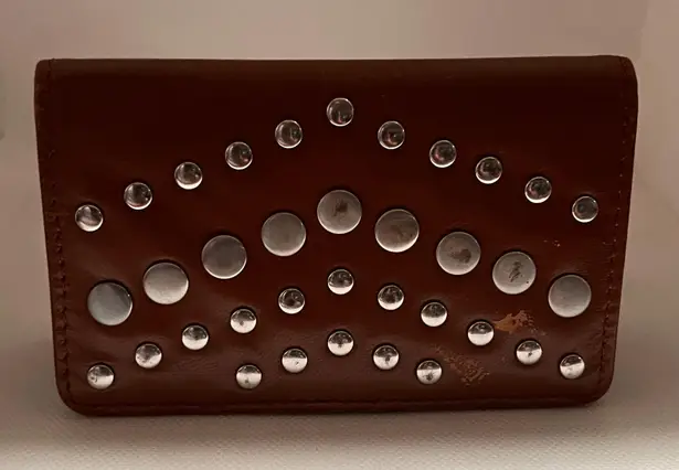 Junior Drake | women’s card holder. COLORS: brown MATERIALS: leather SIZE: 3”x5” Ladies small card holder. The front has silver disc/studs. Bifold. It has a snap closure. The inside has 8- card slots and 2- slide in pockets. Beautiful, soft leather. The front has 2 rubbed spots, see pictures. Good, used condition. ,