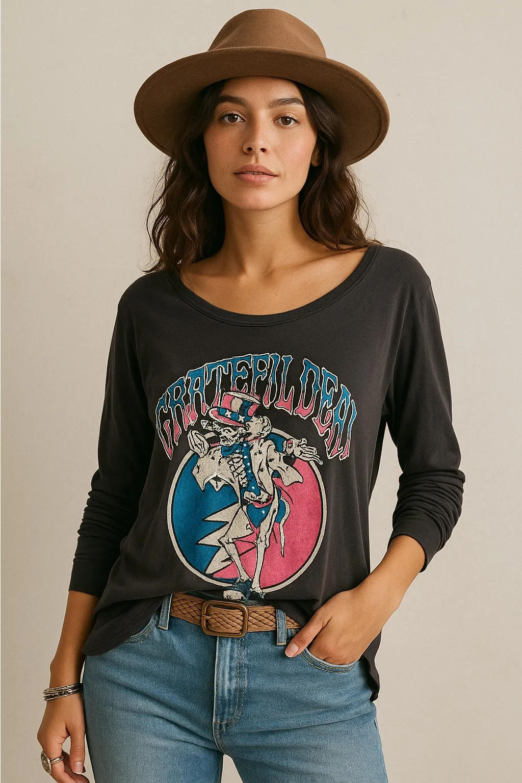 Junk Food Grateful Dead long sleeve tee, a perfectly broken-in piece that captures that vintage rock ‘n’ roll spirit Color: Washed black with red, white, and blue skeleton graphic Material: 50% Cotton / 50% Modal Made in USA Condition: Excellent pre-owned, soft vintage feel Fit: Relaxed drape, lightweight, high low style hemline Size Medium approx pit to pit is 20 length 26-28 grateful dead tee, junk food clothing, vintage band tee, boho rocker style, 70s inspired fashion, music festival outfit, made in USA, relaxed grunge style, vintage rock graphic, soft cotton modal top, distressed band shirt, classic rock outfit, free people vibes, Y2K retro streetwear #gratefuldead #junkfood #bandtee #vintagevibes #boho #festivalstyle #retrostyle #y2k