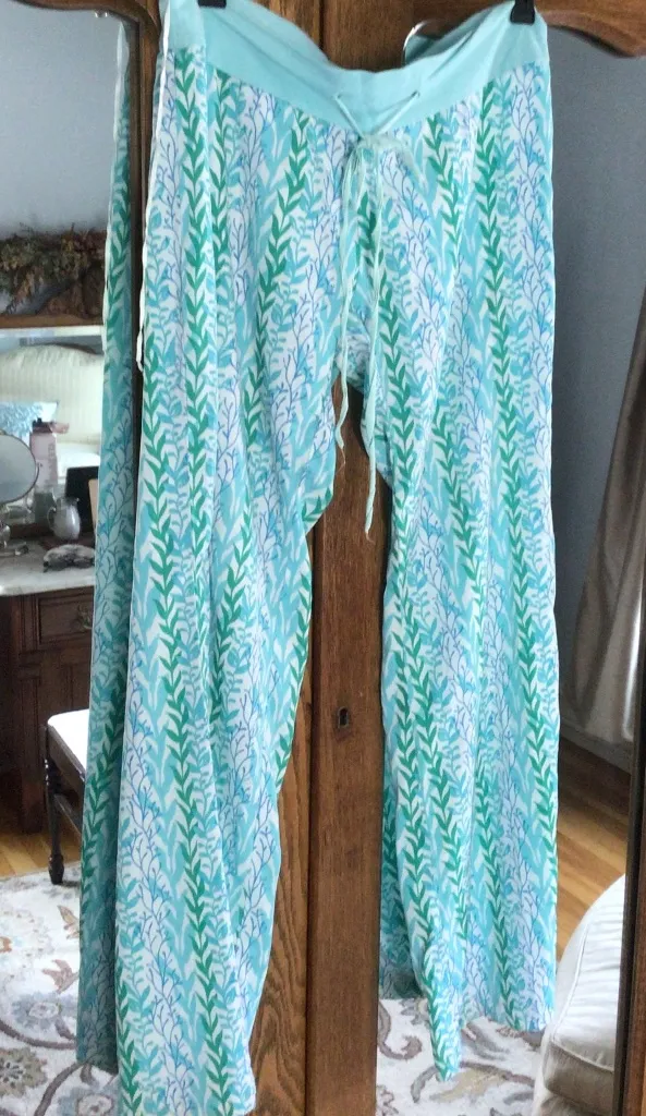 From Just Style comes these wide leg drawstring pants in an allover leaf print multi teal and green size small. Boho Summer fn, trendy colorful, hang out beach pants. Teal wide band waistband in a comfortable jersey fabric. Measurements waist flat uncinched 16”…rise 8”…inseam 30”