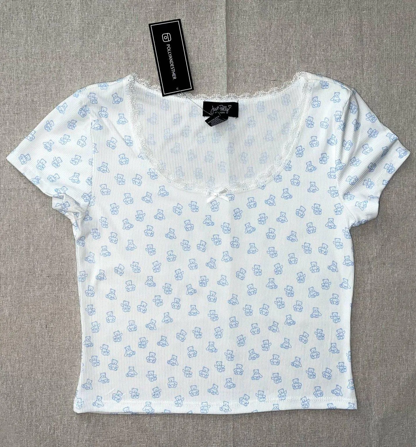 Scoop neck with lace trim and satin bow accents Short sleeves Cropped length Blue teddy bear print Ribbed fabric Machine wash 95% polyester, 5% spandex Approximate measurements (laying flat): Pit to pit: 16" Length: 18" Smoke free home Tags: cropped, graphic tee, teddy bear print, casual, lace, fitted, novelty print, stretch, playful, fun, kawaii, kid core, girlhoodcore, y2k, soft girl, nostalgic, dopamine, flirtcore, casual, pastel, basic