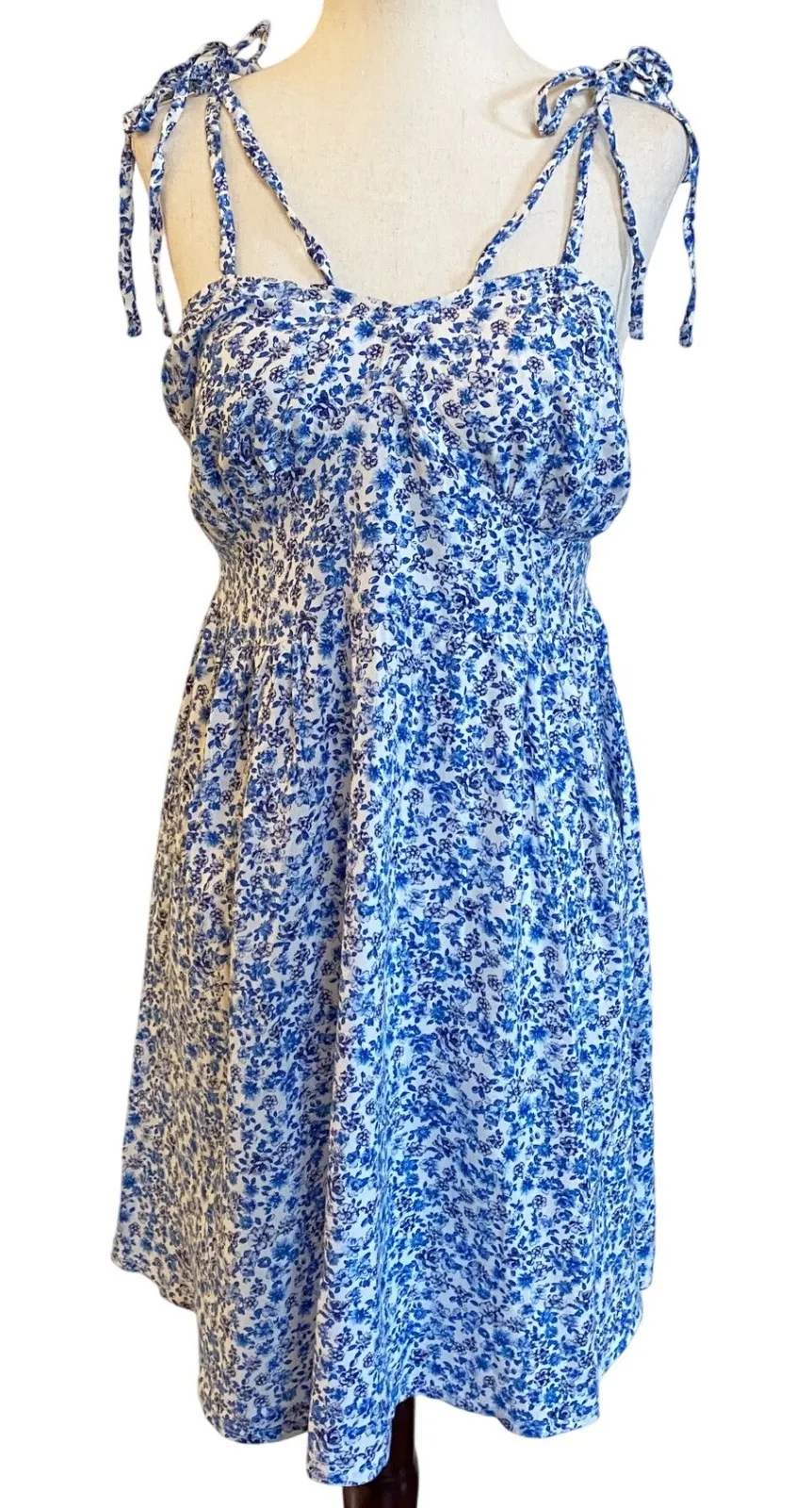 strappy sleeveless floral mini dress Beautiful spring / summertime dress! This white dress is flowy and breathable with a super cute blue floral pattern on it. Size Large Juniors Features adjustable tie straps Smocked back - has stretch Mini length 100% rayon Open to offers Fast shipping Smoke free home Coquette cottage White blue feminine doll porcelain dolls