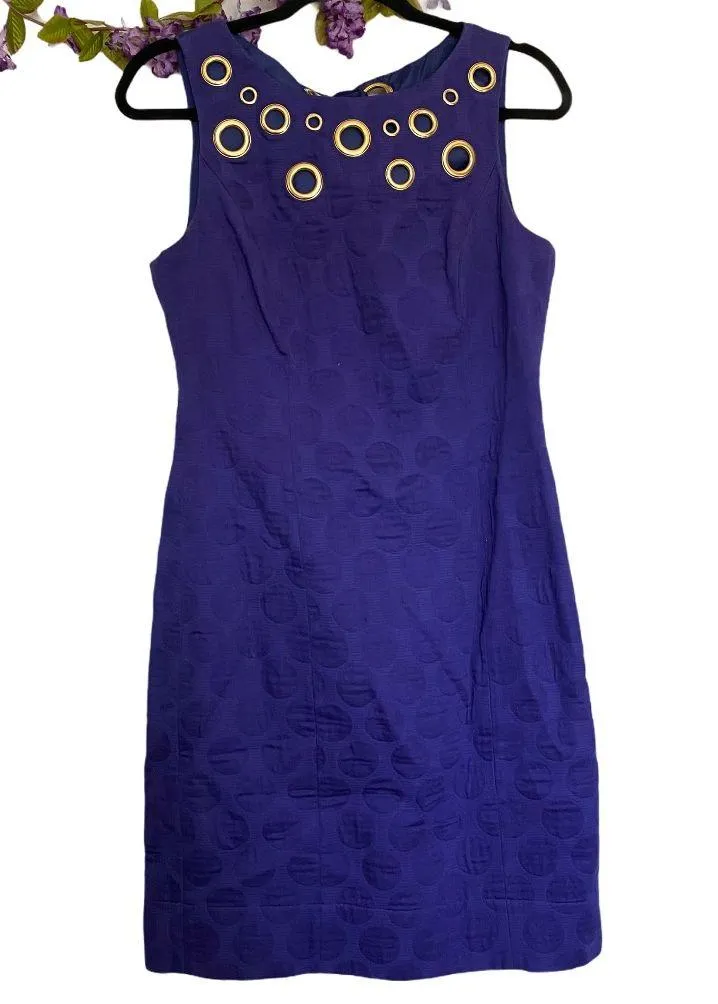 Just Taylor Purple Grommet Polka Dot Ribbon Sleeveless Dress, lined sheath. Taylor Sleeveless Sheath Dress Polka dot design Grommets Back zip with ribbons 100% Cotton • Color:Purple w/Gold Rings •Tag Size: 6 •EXCELLENT Used Condition 1x •Flaw-(2) minor stains on back of dress (last pic) LOC#795H/U *Approximated Measurements are taken while laying the garment flat (one side) NOT Doubled or stretched: •Armpit to armpit:17” •Sleeveless •Length (collar seam-bottom hem):33.5” 15" Waist (not doubled)