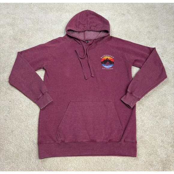 Red hooded sweatshirt with kangaroo pockets and skiing graphic on front and back. Size medium and in good preworn condition. Approximate flat measurements Pit to pit: 21" Length: 28"