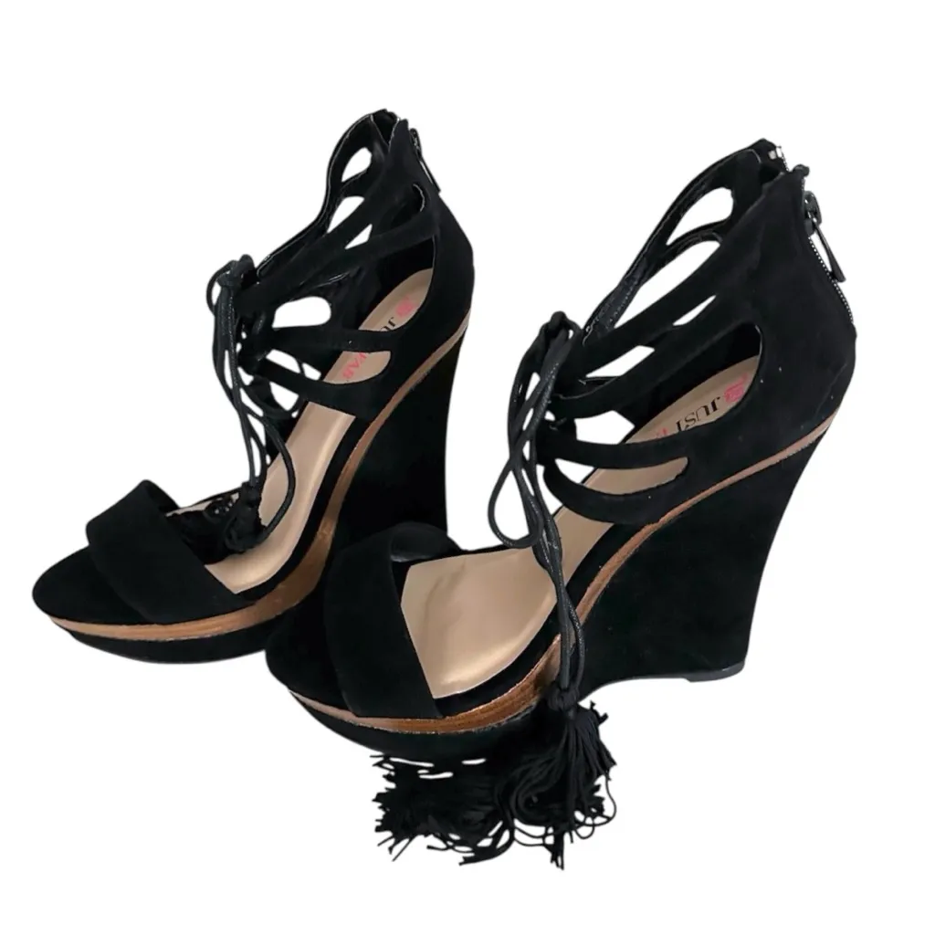 • Black faux suede wedge sandals • Cutout cage-style design with lace-up tassel ties • Back zip cl... Show more