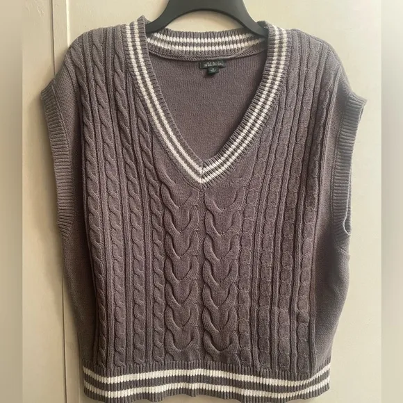 Medium sweater vest for women. Cable knit v neck. Good used condition notice thread ball in photo.