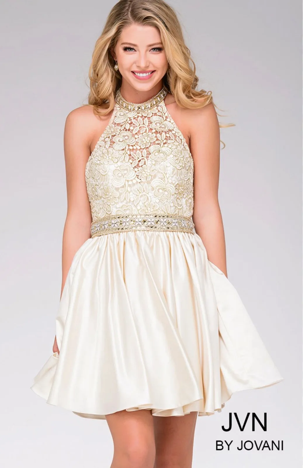 JVN BY JOVANI SHORT COCKTAI/HOMECOMING DRESS IN IVORY. SIZE 6 Embellished Lace Bodice with Satin A-Line skirt *Excellent Preowned Condition except for some faint stains on front of dress shown in last photos.* Price is reflective of flaw.