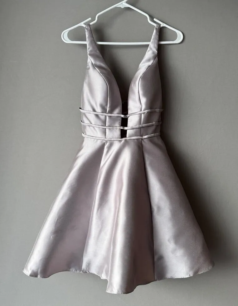 JVN by Jovani sz 0 silver deep plunge fit flare mini cocktail dress Gently used with some unstitching on one of the back design strips. And some self adhesive topstick on inside of bust. Please see photos. This is a pre-owned JVN by Jovani dress, size 0. The dress is made of 100% polyester. It features a V-neckline, a fitted bodice with horizontal strap details, and a flared skirt. The dress is a silver color. It has a zipper closure in the back. The dress is in good condition Measurements: Waist: 26" Hips: up to 44" Length: 32.5" #W020 Weight: 12 oz All thrifted items have been carefully washed with hypoallergenic laundry detergent and packaged with love.