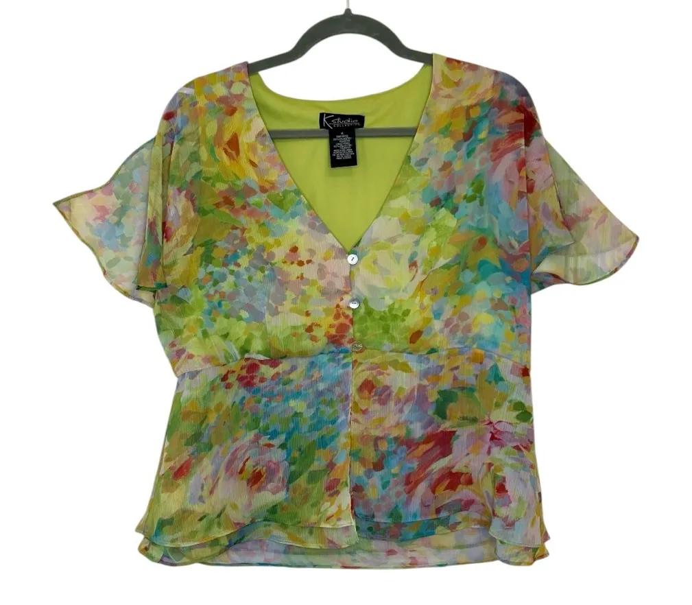 Bright and cheerful K Studio Collection blouse with a watercolor floral print in pink, yellow, green, and blue. Lightweight chiffon with flutter sleeves, V-neckline, and button front. Fully lined for comfort with a flowy, feminine silhouette — perfect for work, spring events, or weekend wear. • Size: 16 • Pit to pit: 20” • Length: 23.5” • Material: 100% polyester, lined • Condition: Pre-owned, excellent condition Ships from a smoke-free, pet-friendly home.