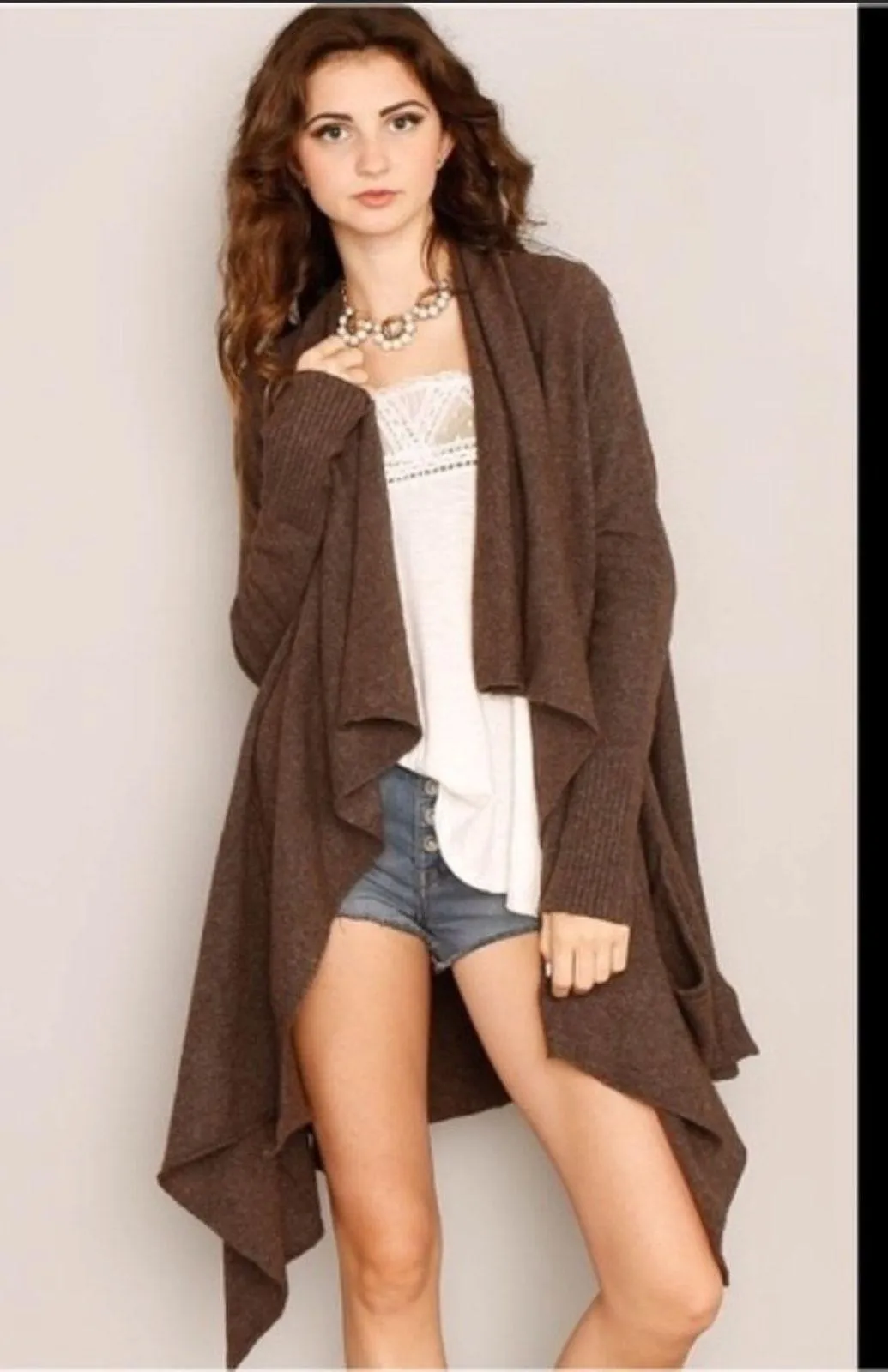 Like New. Beautiful wool blend waterfall front cardigan sweater. Features a soft brown wool blend... Show more
