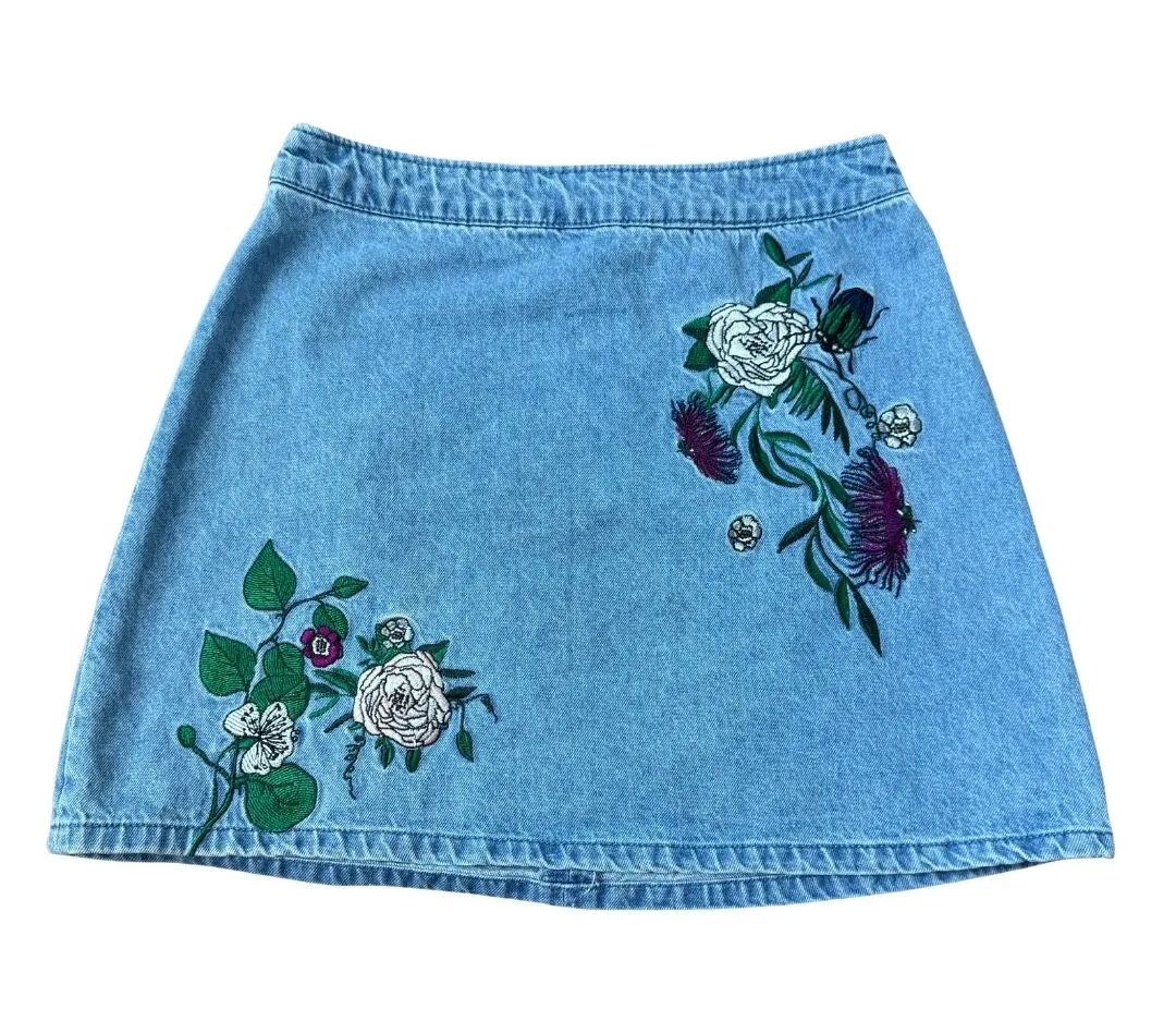 Vintage style denim mini skirt with embroidered flora and fauna from h&m coachella a line size wome... Show more