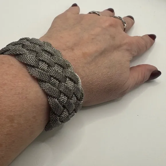 This vintage bracelet features a silver tone metal mesh braided design measuring 7 inches in length and 1.25 inches in width. It is secured with a magnetic closure for convenience. The braided chain adds a unique touch to the overall look of the bracelet, making it a stylish accessory for any outfit.